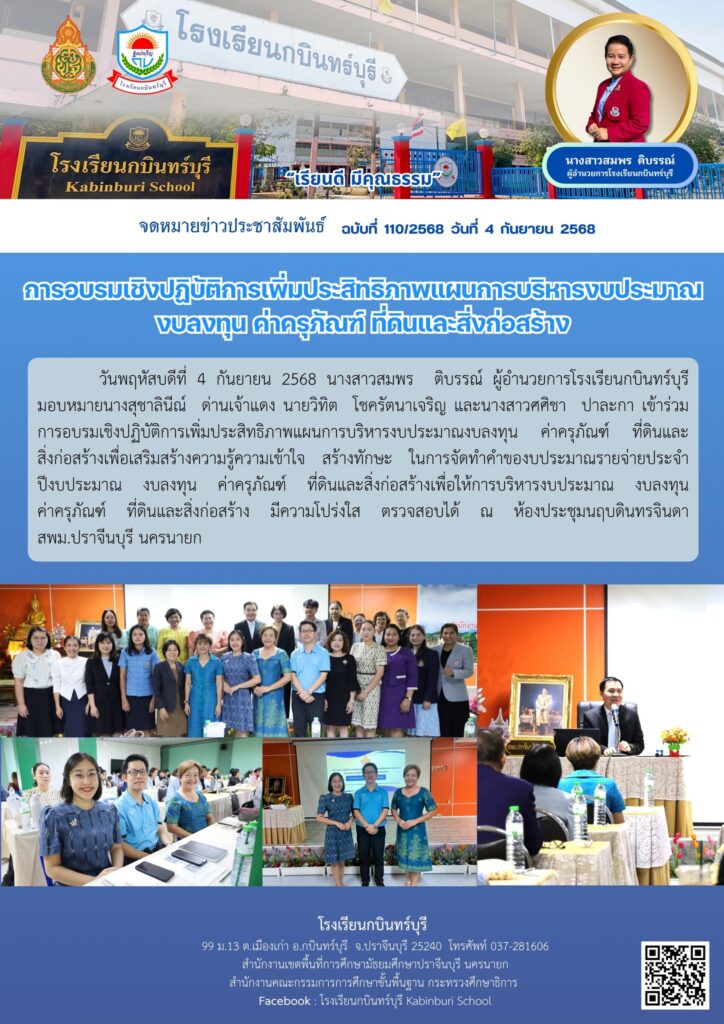วันพุธที่ 3 กันยายน 2568 นางสาวสมพร ติบรรณ์ ผู้อำนวยการโรงเรียนกบินทร์บุรีเข้าร่วมประชุมผู้บริหารสถานศึกษา สังกัดสพม.ปราจีนบุรี นครนายก ครั้งที่ 5/2568 เพื่อขับเคลื่อนความร่วมมือในการบริหารการศึกษาให้เป็นไปอย่างมีประสิทธิภาพ ตามนโยบายของ สพฐ. ในการประชุมครั้งนี้ ดร.อนุพงษ์ ชุมแวงวาปี ผู้อำนวยการอำนวยการสำนักงานเขตพื้นที่การศึกษามัธยมศึกษาปราจีนบุรี นครนายกได้ให้เกียรติในการมอบโล่รางวัล และเกียรติบัตรให้กับโรงเรียนที่ได้รับรางวัลยกระดับการศึกษาด้านต่าง ๆ ณ ห้องประชุมช่อดอกแก้ว โรงเรียนมณีเสวตรอุปถัมภ์ จังหวัดปราจีนบุรี