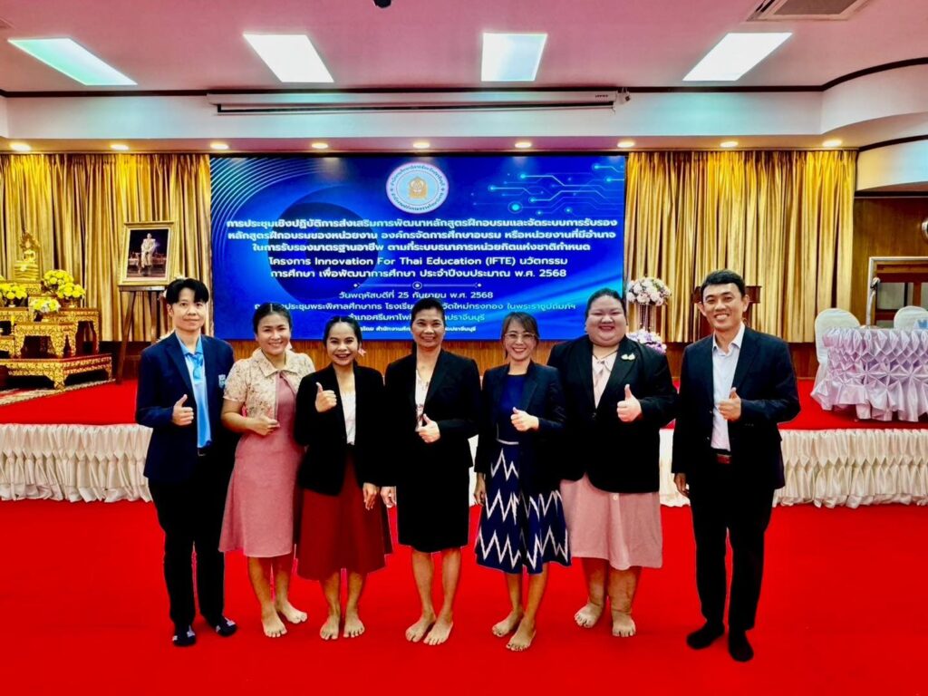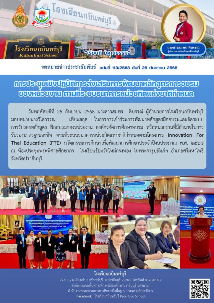 วันพฤหัสบดีที่ 25 กันยายน 2568 นางสาวสมพร ติบรรณ์ ผู้อำนวยการโรงเรียนกบินทร์บุรีมอบหมายนางวิไลวรรณ เทียมสกุล ในการการเข้าร่วมการพัฒนาหลักสูตรฝึกอบรมและจัดระบบการรับรองหลักสูตร ฝึกอบรมของหน่วยงาน องค์กรจัดการศึกษาอบรม หรือหน่วยงานที่มีอำนาจในการ รับรองมาตรฐานอาชีพ ตามที่ระบบธนาคารหน่วยกิตแห่งชาติกำหนดตามโครงการ Innovation For Thai Education (FTE) นวัฒกรรมการศึกษาเพื่อพัฒนาการศึกษาประจำปีงบประมาณ พ.ศ. ๒๕๖๘ณ ห้องประชุมพระพิศาลศึกษากร โรงเรียนร้อมวัดใหม่กรงทอง ในพระรารูปถัมภ์ฯ อำเภอศรีมหาโพธิจังหวัดปราจีนบุรี