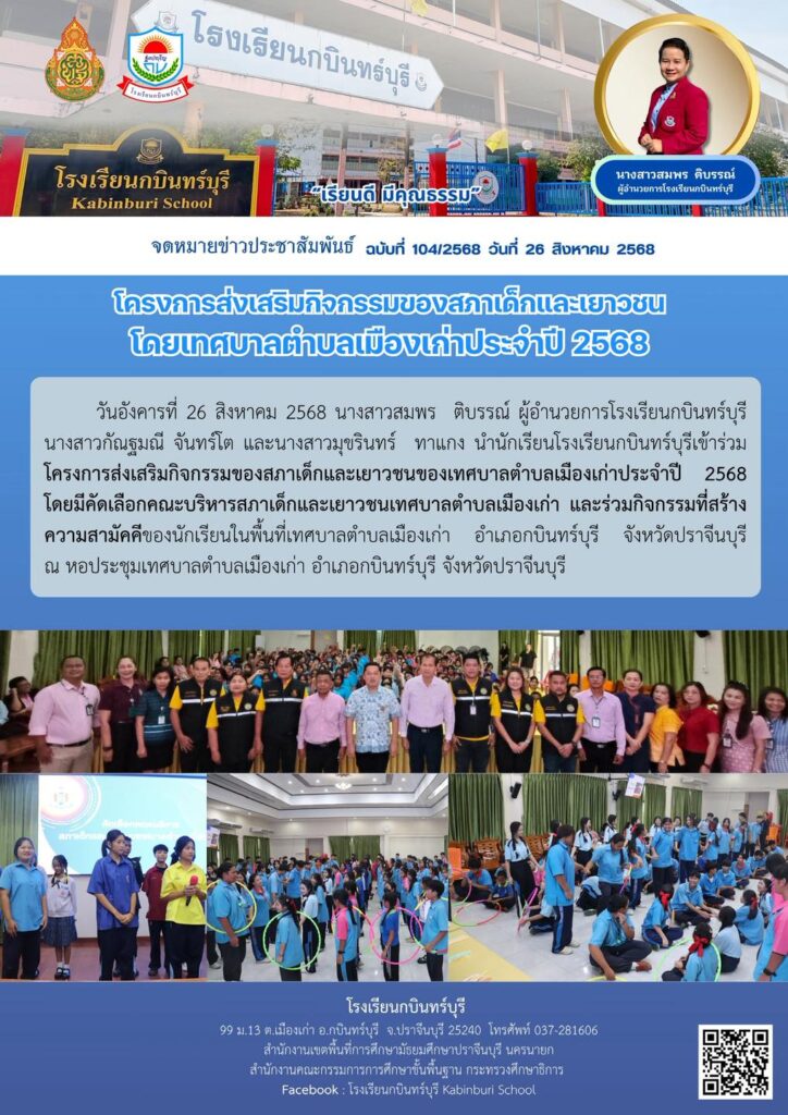 วันอังคารที่ 26 สิงหาคม 2568 นางสาวสมพร ติบรรณ์ ผู้อำนวยการโรงเรียนกบินทร์บุรีนางสาวกัณฐมณี จันทร์โต และนางสาวมุขรินทร์ ทาแกง นำนักเรียนโรงเรียนกบินทร์บุรีเข้าร่วมโครงการส่งเสริมกิจกรรมของสภาเด็กและเยาวชนของเทศบาลตำบลเมืองเก่าประจำปี 2568โดยมีคัดเลือกคณะบริหารสภาเด็กและเยาวชนเทศบาลตำบลเมืองเก่า และร่วมกิจกรรมที่สร้างความสามัคคีของนักเรียนในพื้นที่เทศบาลตำบลเมืองเก่า อำเภอกบินทร์บุรี จังหวัดปราจีนบุรีณ หอประชุมเทศบาลตำบลเมืองเก่า อำเภอกบินทร์บุรี จังหวัดปราจีนบุรี