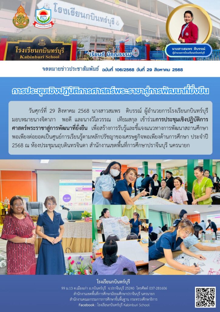 วันศุกร์ที่ 29 สิงหาคม 2568 นางสาวสมพร ติบรรณ์ ผู้อำนวยการโรงเรียนกบินทร์บุรีมอบหมายนางจิดาภา พอดี และนางวิไลวรรณ เทียมสกุล เข้าร่วมการประชุมเชิงปฏิบัติการศาสตร์พระราชาสู่การพัฒนาที่ยั่งยืน เพื่อสร้างการรับรู้และชี้แจงแนวทางการพัฒนาสถานศึกษาพอเพียงต่อยอดเป็นศูนย์การเรียนรู้ตามหลักปรัชญาของเศรษฐกิจพอเพียงด้านการศึกษา ประจำปี 2568 ณ ห้องประชุมนฤบดินทรจินดา สำนักงานเขตพื้นที่การศึกษาปราจีนบุรี นครนายก
